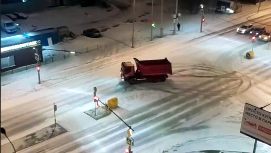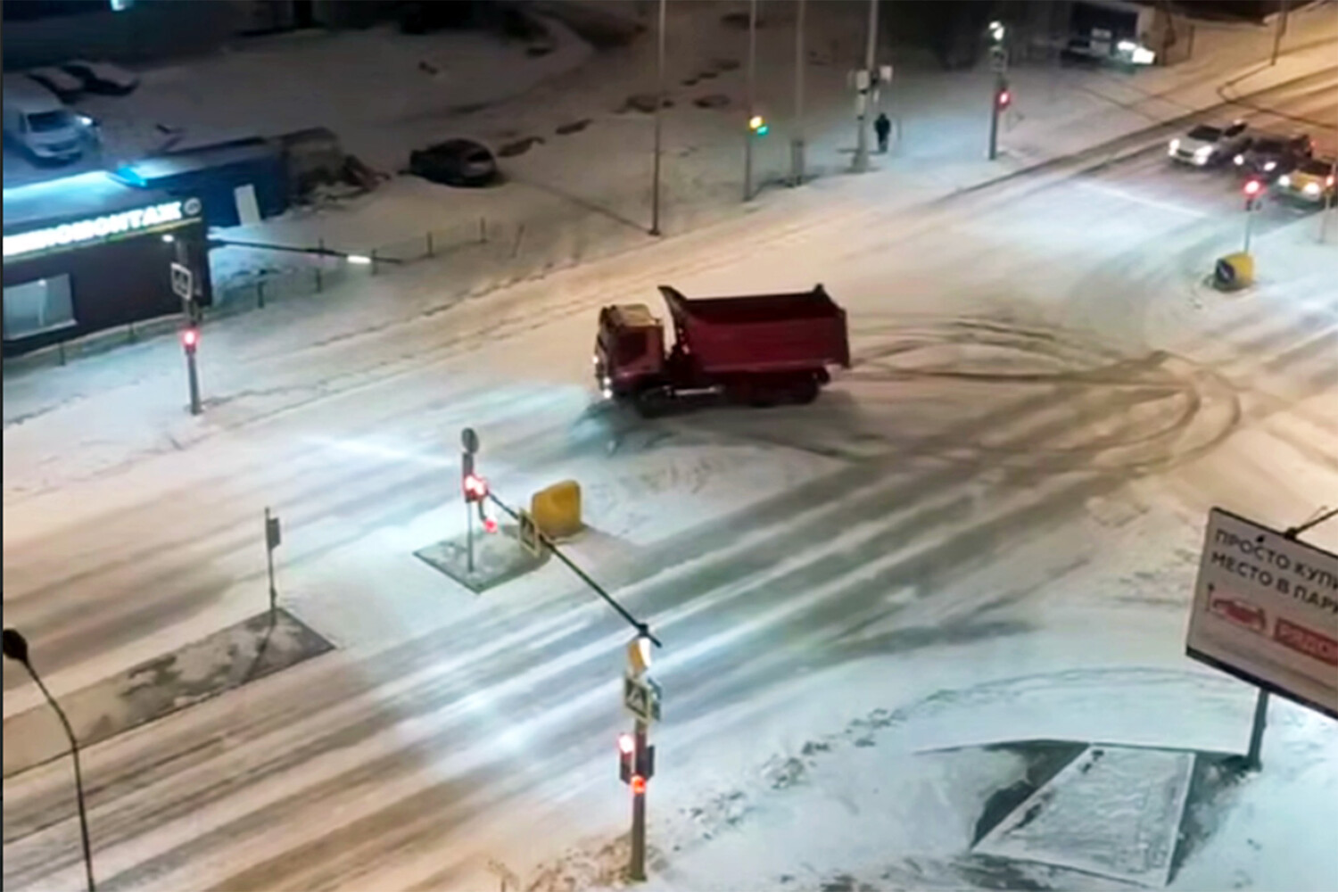 На опубликованных в сети кадрах видно, как самосвал выполняет опасные маневры на заснеженной дороге.