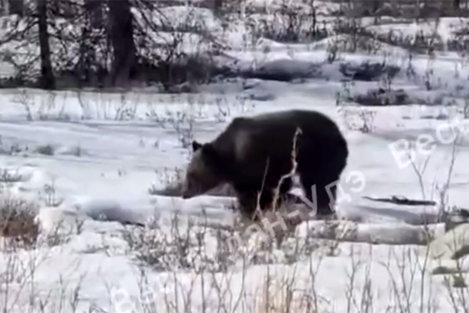 Очевидцы запечатлели произошедшее на видео. На кадрах видно, как медведь идет по снегу, после чего водители начинают сигналить и кричать, чтобы испугать животное, но медведь не реагирует.