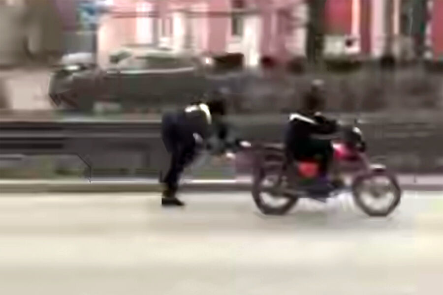 Очевидцы запечатлели инцидент на видео. На кадрах видно, как сотрудник ДПС бежит за проезжающим мотоциклом и толкает транспорт рукой, от чего мотоцикл, водитель и гаишник падают. На записи также видно, что нарушитель встает и пытается сбежать, но сотрудник ДПС успевает его задержать.