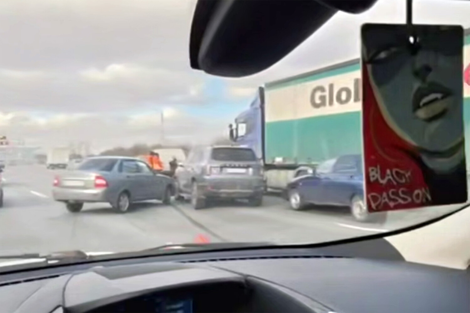 Очевидцы запечатлели последствия ДТП на видео. На кадрах видно, что несколько транспортных средств, которые ранее столкнулись, перегородили полосы движения.