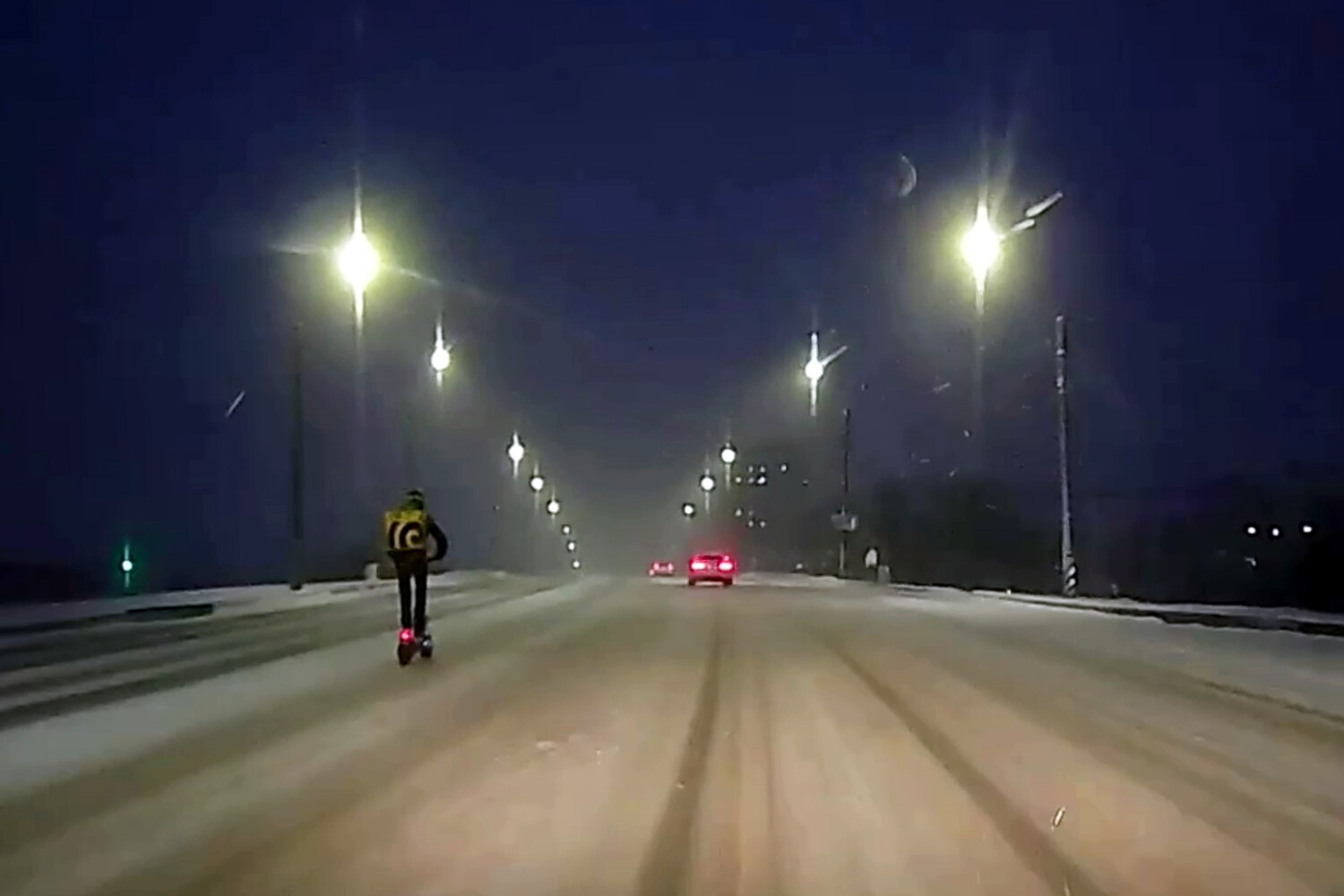 В Москве на видео попало, как электросамокатчик ехал по трассе в снегопад