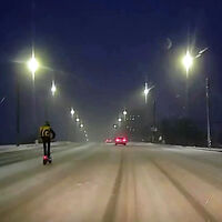 Видеорегистратор автомобиля, водитель которого стал очевидцем инцидента, запечатлел произошедшее. На кадрах видно, как мужчина на электросамокате едет по заснеженным дорогам. Кроме того, на записи также видно, что в момент его поездки шел снег.