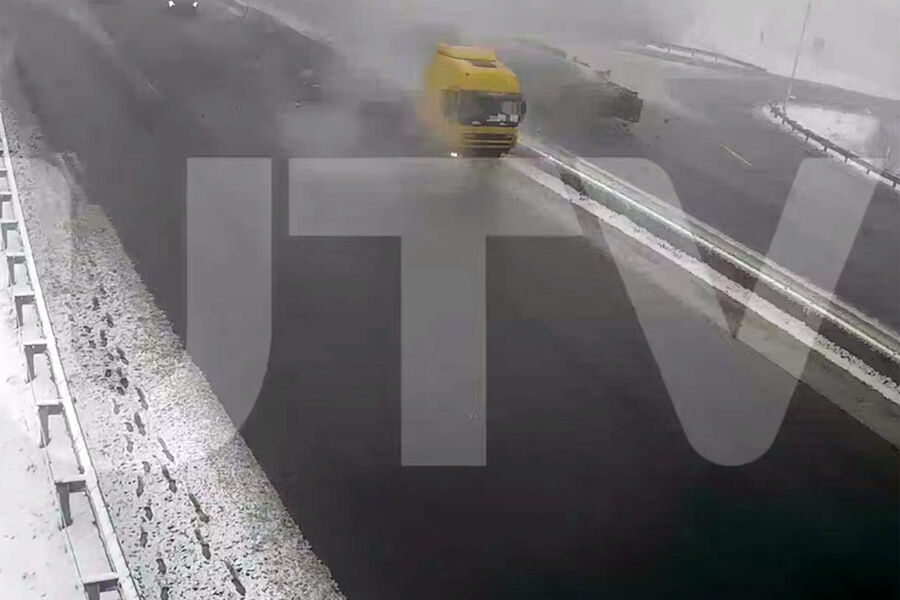 Telegram-канал «Телеканал UTV» опубликовал видео с камеры наблюдения. На кадрах видно, как большегруз выезжает на соседнюю полосу движения и сталкивается с легковой машиной. От удара задняя часть грузовика переворачивается и отлетает в сторону.