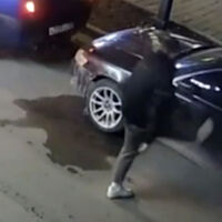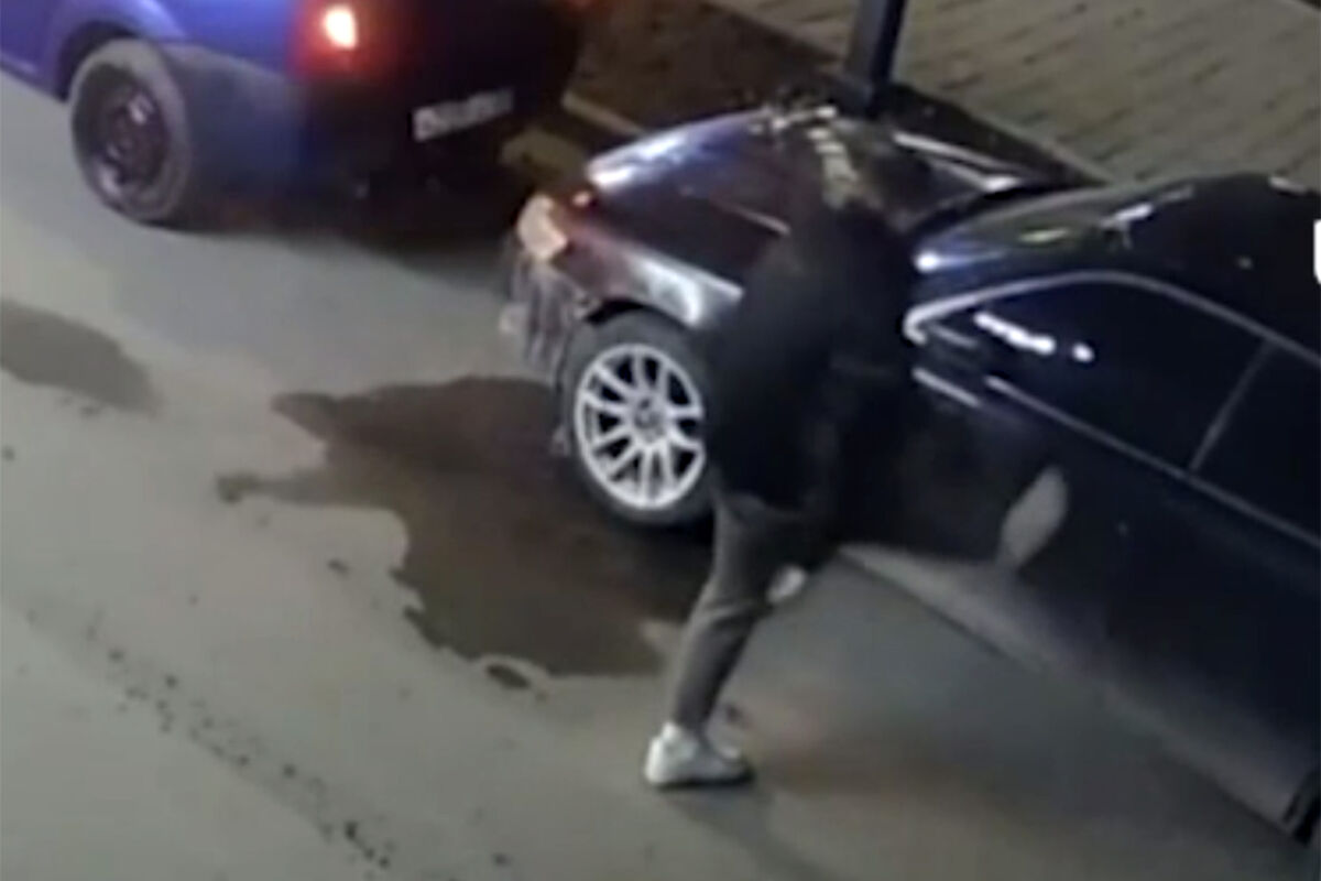 Уличные камеры запечатлели инцидент. На кадрах видно, как мужчина пинает припаркованные автомобили, от чего у них срабатывает сигнализация.