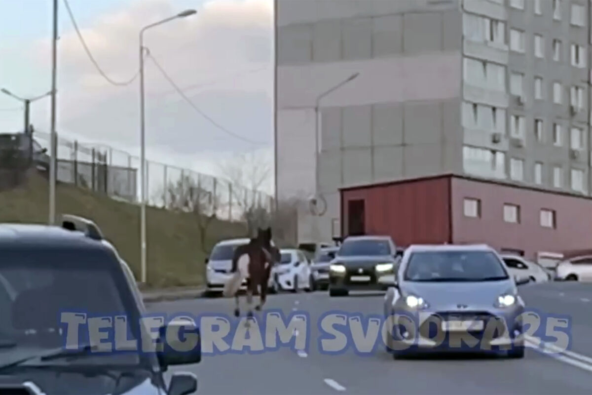 «Во Владивостоке около Нагорного парка испуганная лошадь бегает по проезжей части. Бедняга, судя по всему, убежала от хозяев и сейчас в испуге бегает по проезжей части у Нагорного парка», — говорится в сообщении.