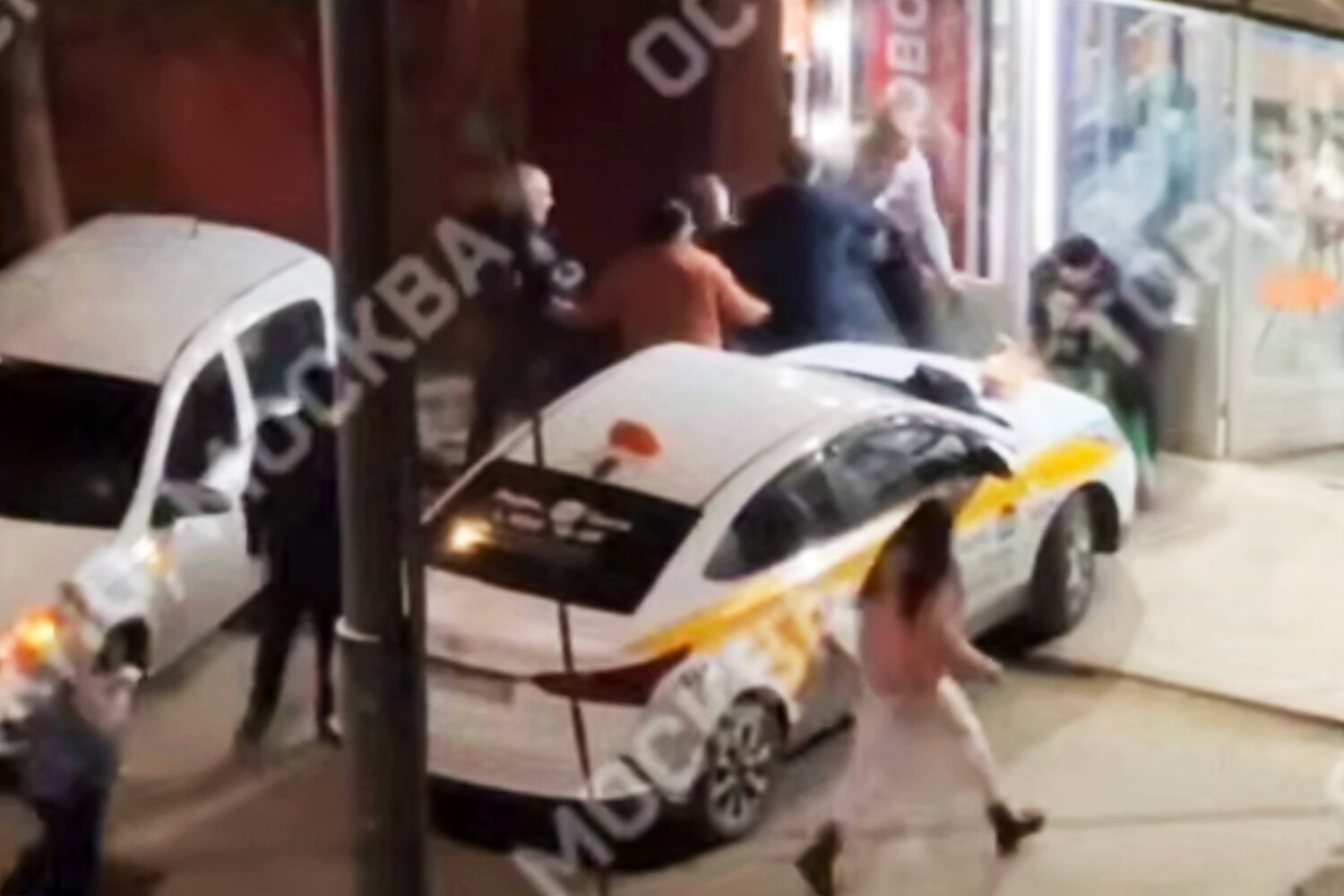 Уличная камера запечатлела инцидент. На кадрах видно, как люди выбегают на проезжую часть, один из мужчин ударяет по белому легковому автомобилю, от чего срабатывает сигнализация. Затем начинается драка: конфликтующие перемещаются на тротуар. На записи также видно, что женщина пытается их разнять.