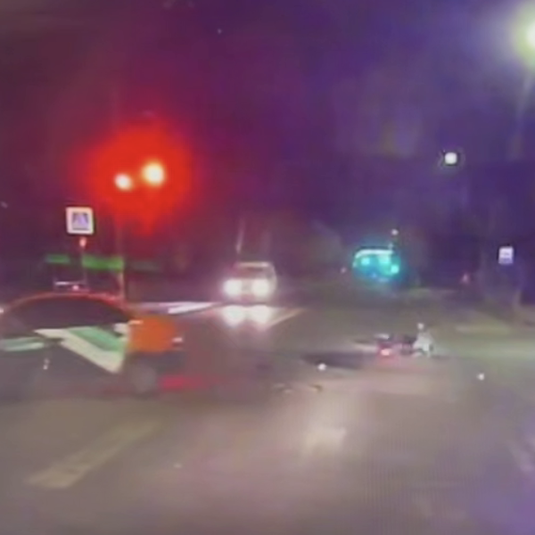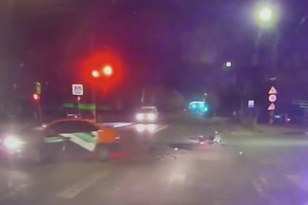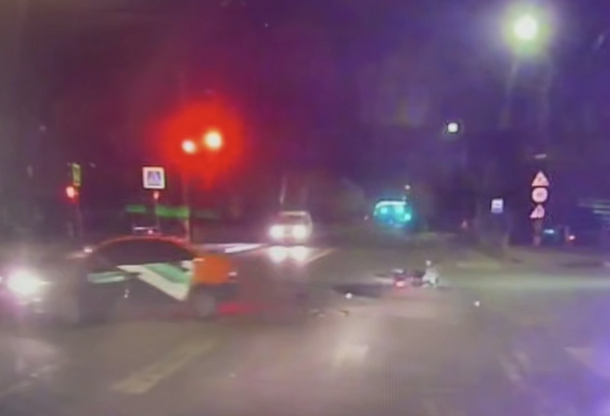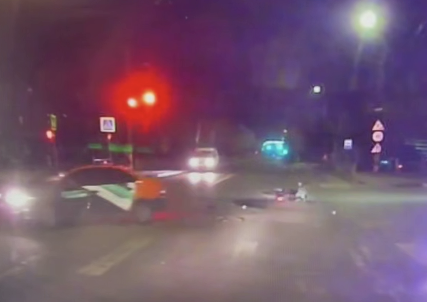 Видеорегистратор автомобиля, водитель которого стал очевидцем происходящего, запечатлел инцидент. На кадрах видно, как автомобиль выезжает на встречную полосу движения, где в него врезается мотоцикл, который отлетает в сторону. На записи сначала видны искры, после чего транспорт начинает гореть.