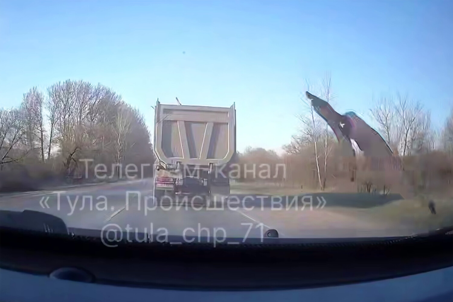 Видеорегистратор автомобиля, водитель которого стал очевидцем произошедшего, запечатлел инцидент. На кадрах видно, как мусор вылетает из грузовика в сторону автомобиля, при этом не наносит транспорту повреждений.