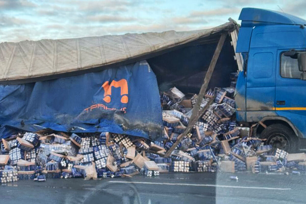 Очевидцы запечатлели последствия инцидента на видео. На кадрах видно, что на дороге стоит фура, вокруг которой лежат упакованные банки с пивом. На записи также видно, что напиток вылился на проезжую часть. По информации источника, «фура и пиво» затруднили движение на трех полосах дороги.