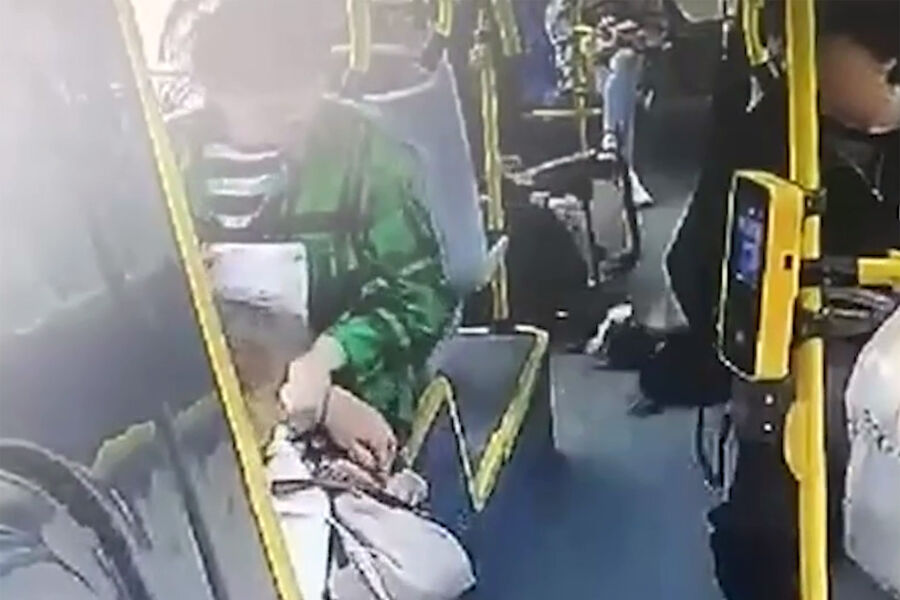 Камера, установленная в автобусе, запечатлела инцидент. На кадрах видно, как коляска переворачивается и падает, при этом по салону летят вещи других пассажиров.