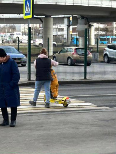 На опубликованной фотографии видно, что женщина везет мальчика через пешеходный переход на электросамокате.