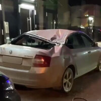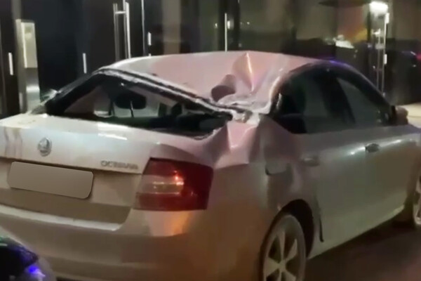 На опубликованных в сети кадрах видно, что у серого легкового автомобиля смята крыша и выбито стекло.
