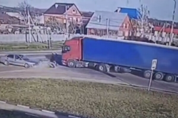 Уличная камера запечатлела инцидент. На кадрах видно, как подростки на питбайке врезаются в серый легковой автомобиль, падают с транспорта и вылетают под колеса проезжающей фуры.