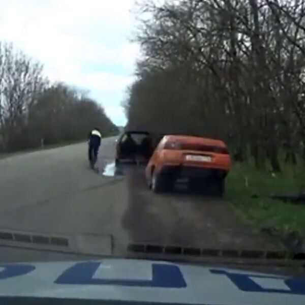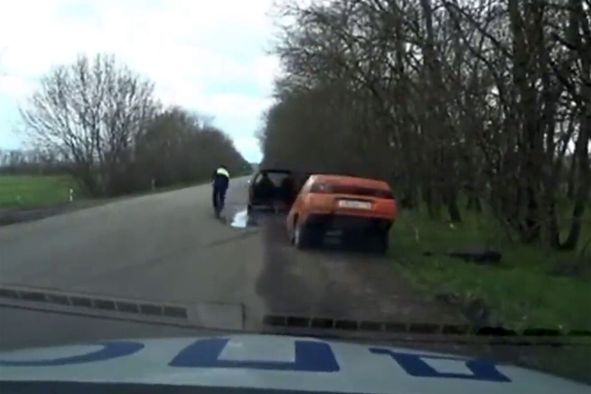 Видеорегистратор патрульного автомобиля запечатлел инцидент на камеру. На кадрах видно, как оранжевый легковой автомобиль пытается скрыться от инспекторов ГИБДД, но после останавливается. В момент, когда гаишники подходят к автомобилю, задняя часть машины отделяется, а передняя – уезжает.