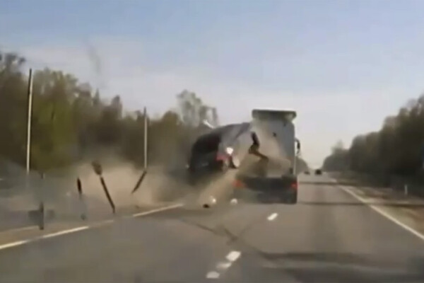 Видеорегистратор машины, водитель которой стал очевидцем произошедшего, запечатлел ДТП. На кадрах видно, как легковой автомобиль выезжает на соседнюю полосу движения, где сталкивается с тягачом, от удара первый таранит ограждение и перелетает через транспорт. После этого люди выходят из поврежденной машины. На записи также видно, что запчасти от автомобилей разлетелись по проезжей части.
