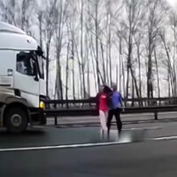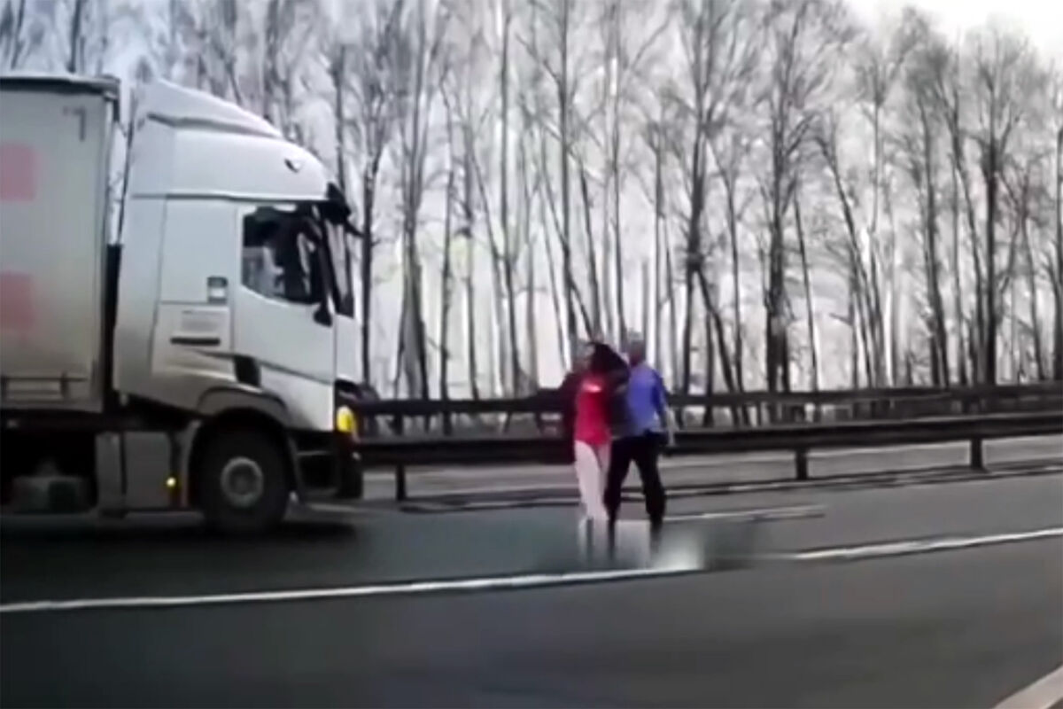 Видеорегистратор автомобиля, водитель которого стал очевидцем произошедшего, запечатлел инцидент. На кадрах видно, как женщина мешает проезду транспорта. Сначала она останавливается на проезжей части перед фурой, которая объезжает нарушительницу, после чего — перегораживает проезд большегрузу. Далее на записи видно, как водитель выходит из транспорта, берет женщину за руку и ведет к краю дороги, где перекидывает нарушительницу через ограждение.