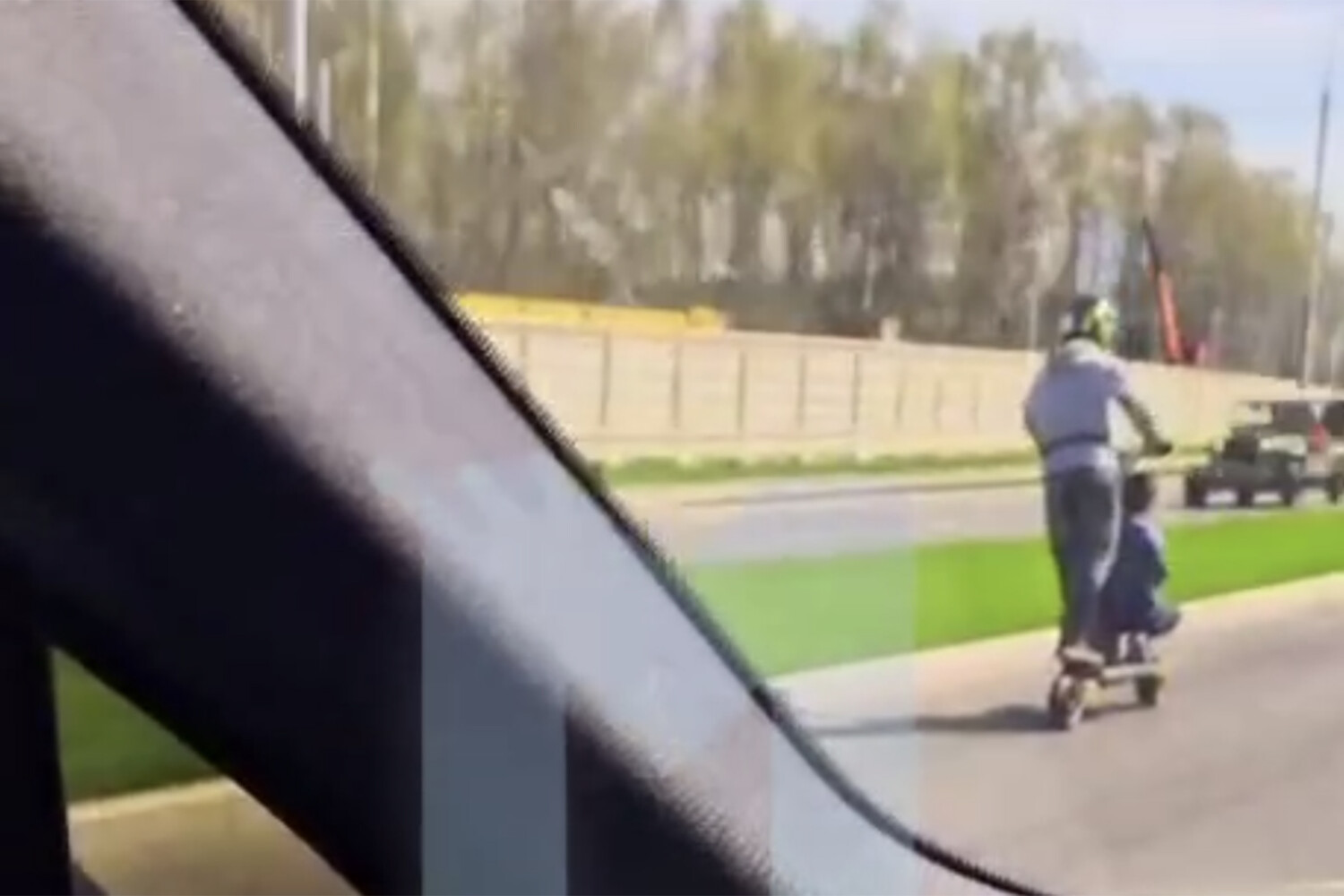 Очевидцы запечатлели инцидент на видео. На кадрах видно, как два школьника едут на одном самокате, при этом один из нарушителей сидит на корточках. На записи также видно, что они едут в потоке автомобилей на большой скорости.
