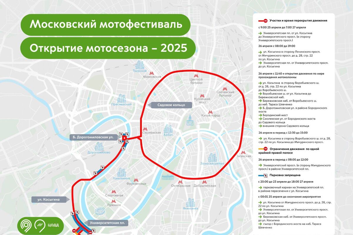 Наиболее заметным будет ограничение движения по внешней стороне Садового кольца, а также на улицах Косыгина, Большая Дорогомиловская и Смоленская, а также на Воробьевском шоссе, Бережковской набережной с 11:40 в субботу, 26 апреля.