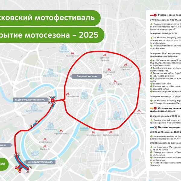 В Москве также будет запрещена парковка в парковочном кармане на Университетской площади в районе пересечения с улицей Косыгина с 23 апреля вплоть до завершения мероприятий. Парковка не будет доступна также с 00:01 25 апреля до окончания мероприятия — на Бережковской набережной, Университетской площади, улице Косыгина и на съезде с Бородинского моста на набережную Тараса Шевченко.