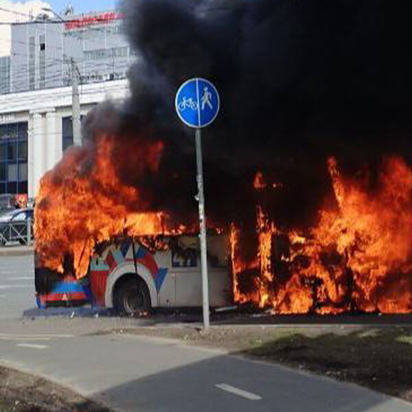 На кадрах видно, что автобус находится на проезжей части. От него поднимается густой столб дыма. В районе пожара движение транспорта затруднено. Возгорание тушат прибывшие по вызову пожарные.