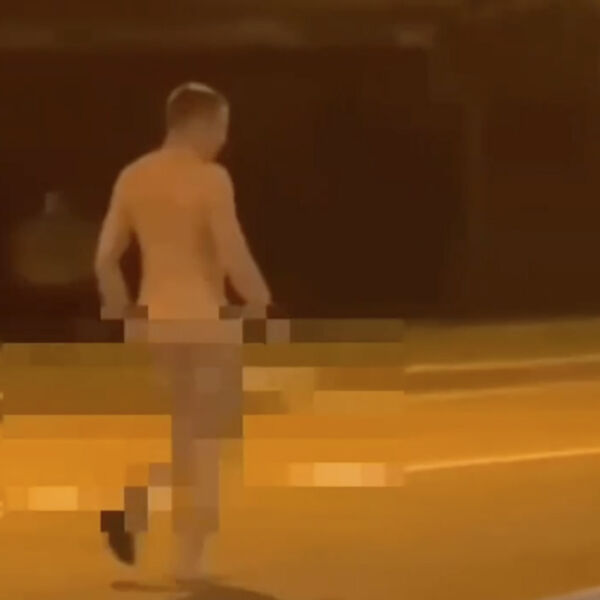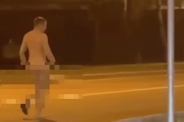 Очевидец запечатлел инцидент на камеру. На кадрах видно, как голый мужчина в одном черном носке перебегал проезжую часть в необорудованном для пешеходов месте.