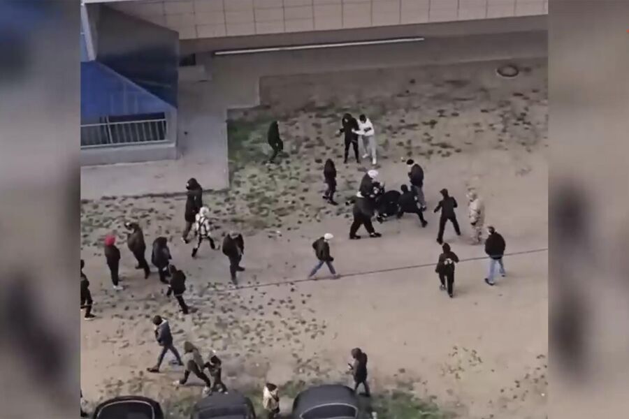 Очевидцы запечатлели инцидент на видео. На кадрах видно, как несколько мужчин дерутся, при этом вокруг конфликтующих собрались десятки людей.