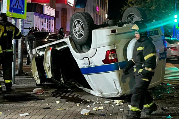 Уличная камера запечатлела инцидент. На кадрах видно, как патрульная машина выезжает на перекресток и врезается в легковой автомобиль. От удара машина полицейских переворачивается на проезжей части.