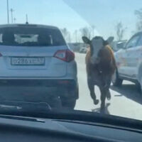 Очевидцы запечатлели инцидент на видео. На кадрах видно, как бык бежит по проезжей части между автомобилями.