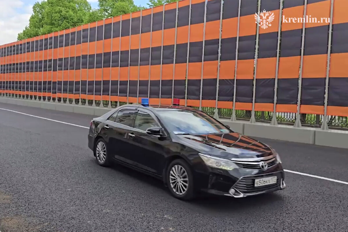 Произошедшее запечатлели на видео. На кадрах видно, как кортежи едут по дороге, вдоль которой натянута большая Георгиевская лента.