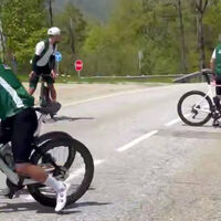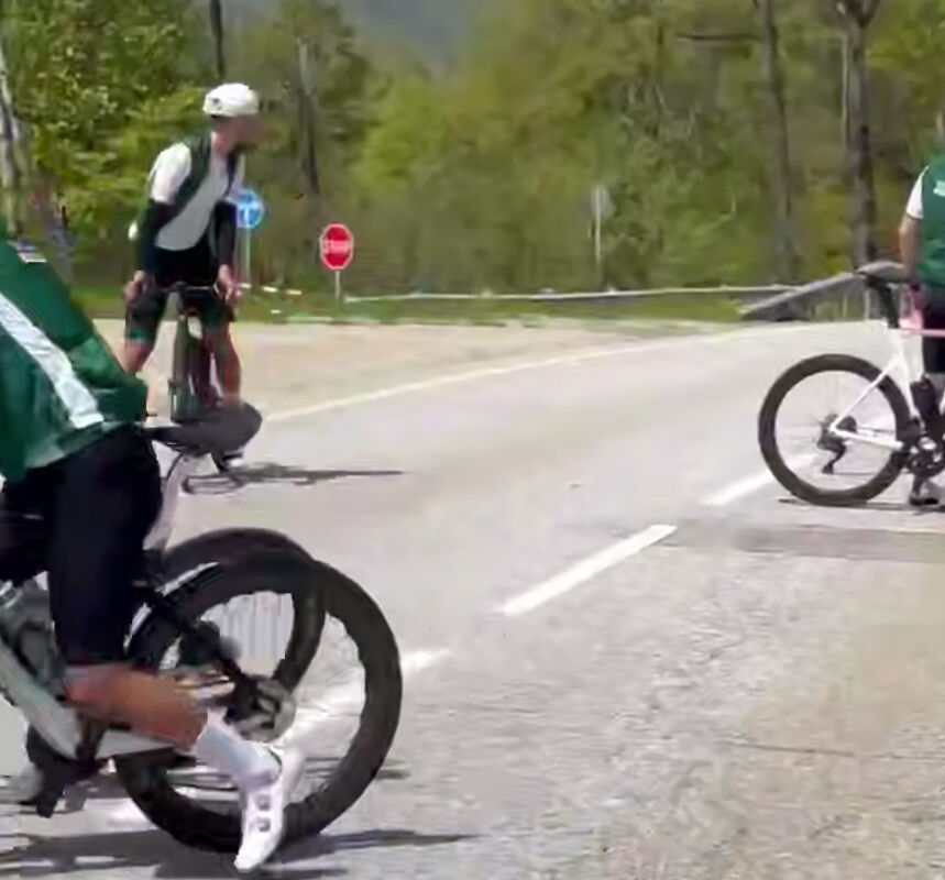 «Пелотон гнал по красивым дорогам среди гор, как вдруг у команды появился новый перспективный тренер. Он внезапно выбежал прямо на дорогу, и велосипедисты уже собирались втопить в обратную сторону, но помог клаксон — мишка испугался и убежал в лес», — говорится в сообщении.