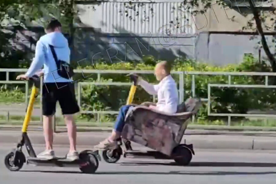 Очевидцы запечатлели инцидент на видео. На кадрах видно, как школьник сидит на старом кресле, которое стоит на электросамокате. При этом транспорт движется по проезжей части. На записи также видно, что рядом с нарушителем едет другой подросток, который, как положено, стоит на самокате.
