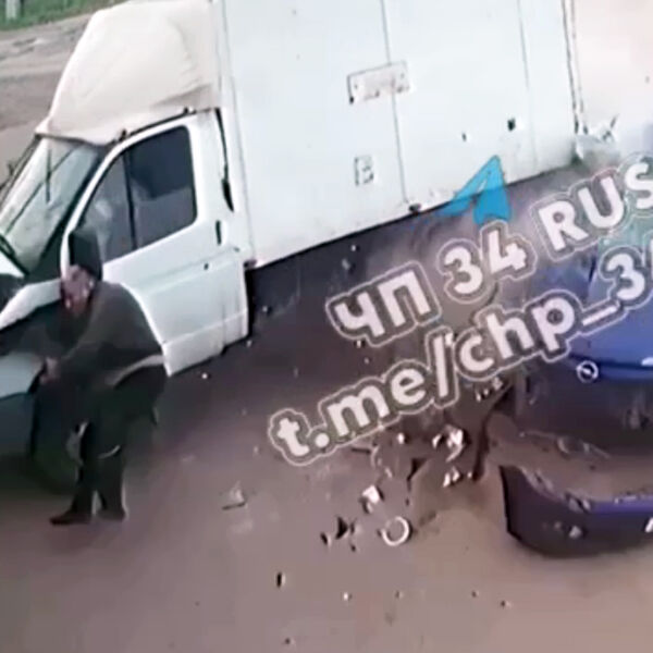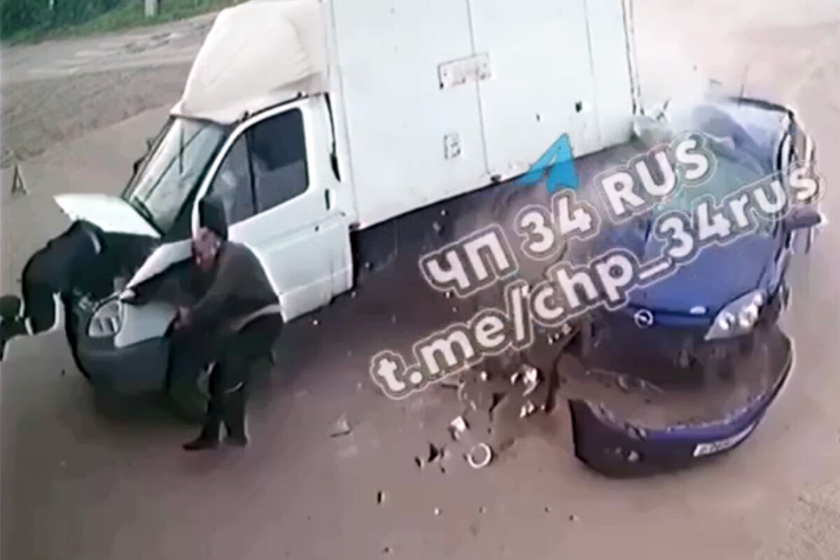 Уличная камера запечатлела инцидент на видео. На кадрах видно, как синий легковой автомобиль сворачивает с проезжей части и боком врезается в грузовик. От удара транспорт отлетает в мужчин, которые ранее чинили грузовик.
