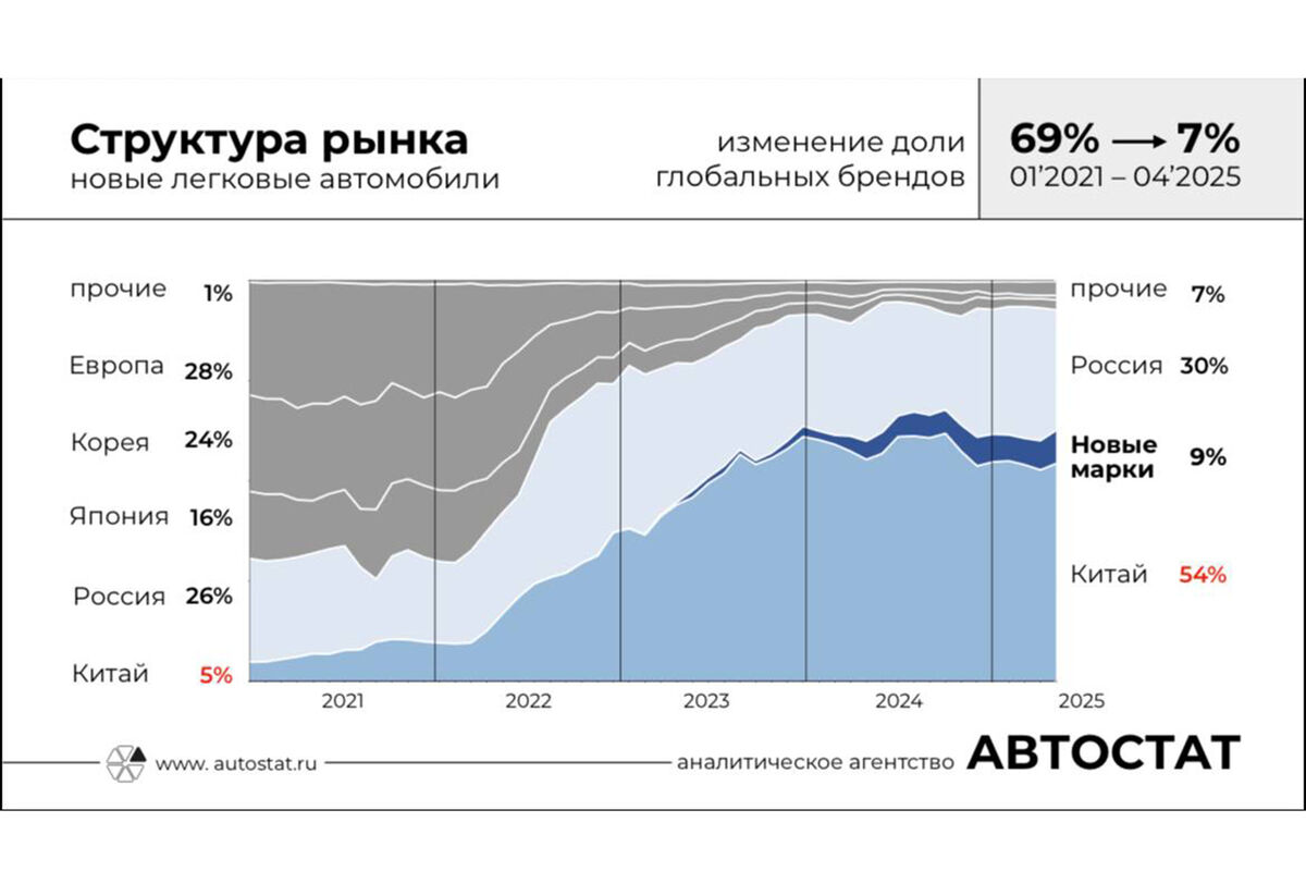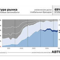 «За последние 4 года доля глобальных брендов (без учета китайских) на российском авторынке сократилась примерно в 10 раз. Если в начале 2021 года на них приходилось 69% рынка, то сейчас лишь 7%», — написал он в своем Telegram-канале.