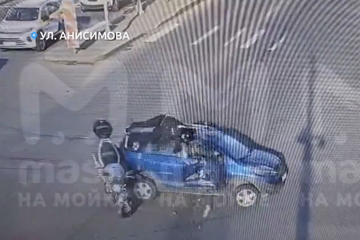 Уличная камера запечатлела инцидент на видео. На кадрах видно, как мотоциклист врезается в бок синего автомобиля. От удара байкер подлетает и приземляется на асфальт, после чего начинает трястись. На записи также видно, как к пострадавшему подходят очевидцы и водитель Chery.
