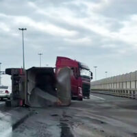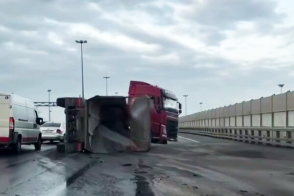Очевидцы запечатлели инцидент на видео. На кадрах видно, что перевернутый большегруз лежит на проезжей части, а автомобили его объезжают.