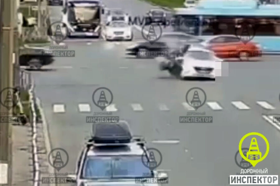 Уличная камера запечатлела инцидент на видео. На кадрах видно, как мотоциклист врезается в бок синего автомобиля. От удара байкер подлетает и приземляется на асфальт, после чего начинает трястись.