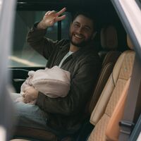 На опубликованной в сети фотографии блогер держит новорожденного ребенка и улыбается. На кадрах также видно, что мужчина сидит в люксовом автомобиле с коричневым салоном.
