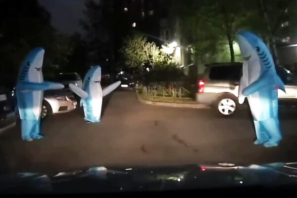 В Санкт-Петербурге ростовые куклы акул мешали проезду транспорта. Об этом сообщает Telegram-канал «Новости Питера».
