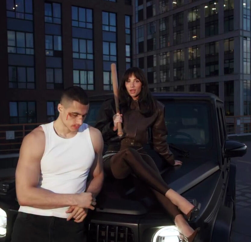 На записи видно, что исполнительница сидит на капоте черного автомобиля Mercedes, держит в руках биту и поет песню. При этом рядом стоит мужчина в белой майке и с разбитым лицом.