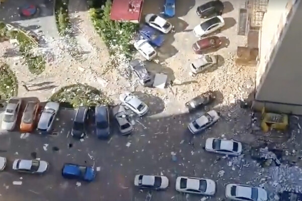 Очевидцы запечатлели последствия взрыва на видео. На кадрах видно, что обломки повредили припаркованные автомобили. У машин помяты кузова и разбиты стекла.