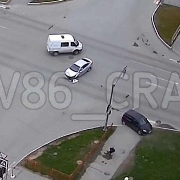 Уличная камера запечатлела инцидент на видео. На кадрах видно, как на перекрестке сталкиваются два автомобиля, один из которых на скорости съезжает с проезжей части и едет в сторону школьника, который при виде ДТП начинает убегать.