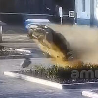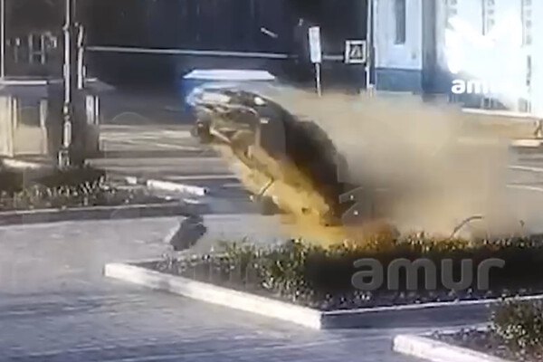На кадрах видно, как черная легковая машина вылетает с проезжей части и приземляется на дорогу. На записи также видно, как в момент ДТП разлетаются автомобильные части.