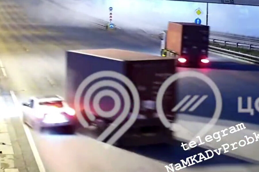 На опубликованных в сети кадрах видно, как прицеп отрывается от фуры и начинает отдельно двигаться по проезжей части, после чего он врезается в белый легковой автомобиль, водитель которого пытается избежать столкновения, но у него не выходит.