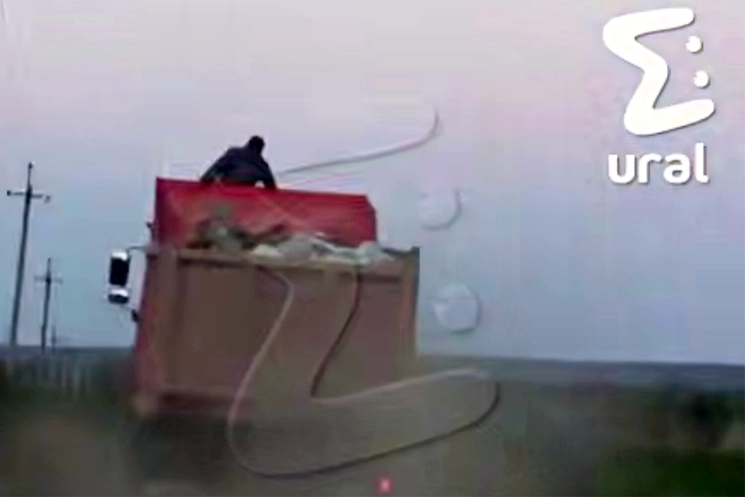 Женщина сняла произошедшее на видео. На кадрах видно, как мужчина сидит в кузове с мусором и кричит, при этом большегруз движется по дороге.