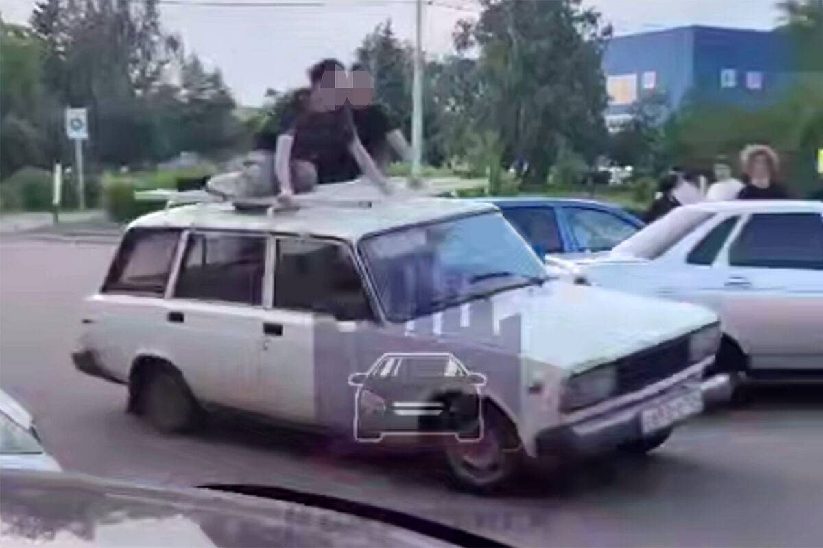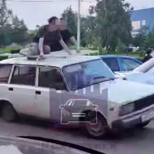 Очевидцы запечатлели инцидент на видео. На кадрах видно, как два человека сидят на крыше движущейся машины.