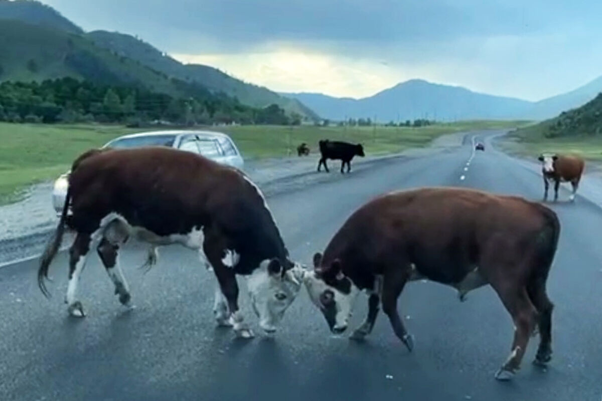В Горном Алтае быки бодались на проезжей части. Об этом сообщает Telegram-канал Mash Siberia.