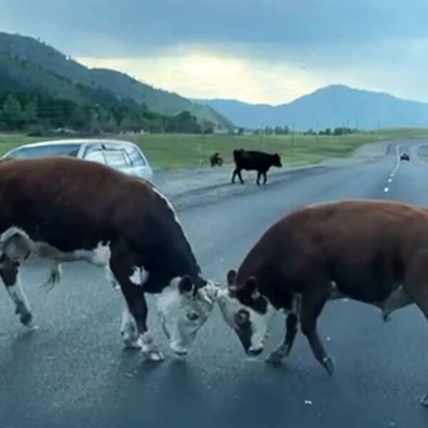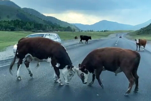 «Быки устроили битву за любовь на дороге в Горном Алтае. Замес случился сразу на двух полосах, поэтому водителям пришлось аккуратничать и стараться не отвлекаться на поединок», — говорится в сообщении.