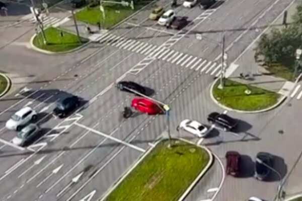 Уличная камера запечатлела инцидент. На кадрах видно, как мотоциклист на большой скорости врезается в красный автомобиль, от удара байкер подлетает в воздух, вращается и падает на проезжую часть.