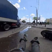На опубликованных в сети кадрах видно, как мужчина на моноколесе едет в потоке автомобилей, после чего врезается в остановившуюся «Газель». От удара он падает на проезжую часть. После ДТП моноколесник сообщает водителю грузовика, что с ним все нормально.