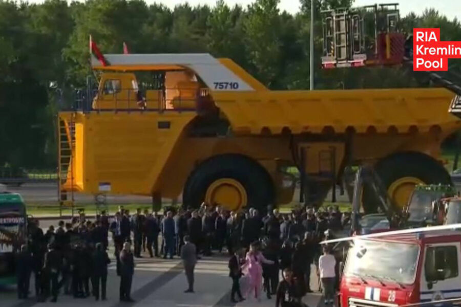«Президент РФ Владимир Путин осмотрел выставку достижений белорусского автопрома, где увидел самый большой карьерный самосвал в мире», — отмечается в сообщении.